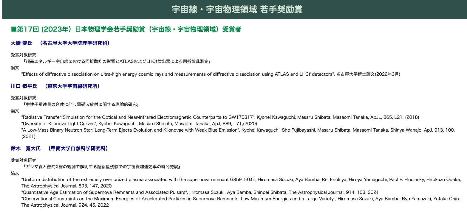 I have been selected as a winner of the Young Scientist Award of the Physical Society of Japan. The prize is for my studies on particle acceleration physics in supernova remnants through gamma-ray and thermal X-ray observations. Prof. T. Tanaka gave a recommendation for the award. Related links: JPS pdf (English), JPS webpage (Japanese), webpage by Konan University (Japanese)