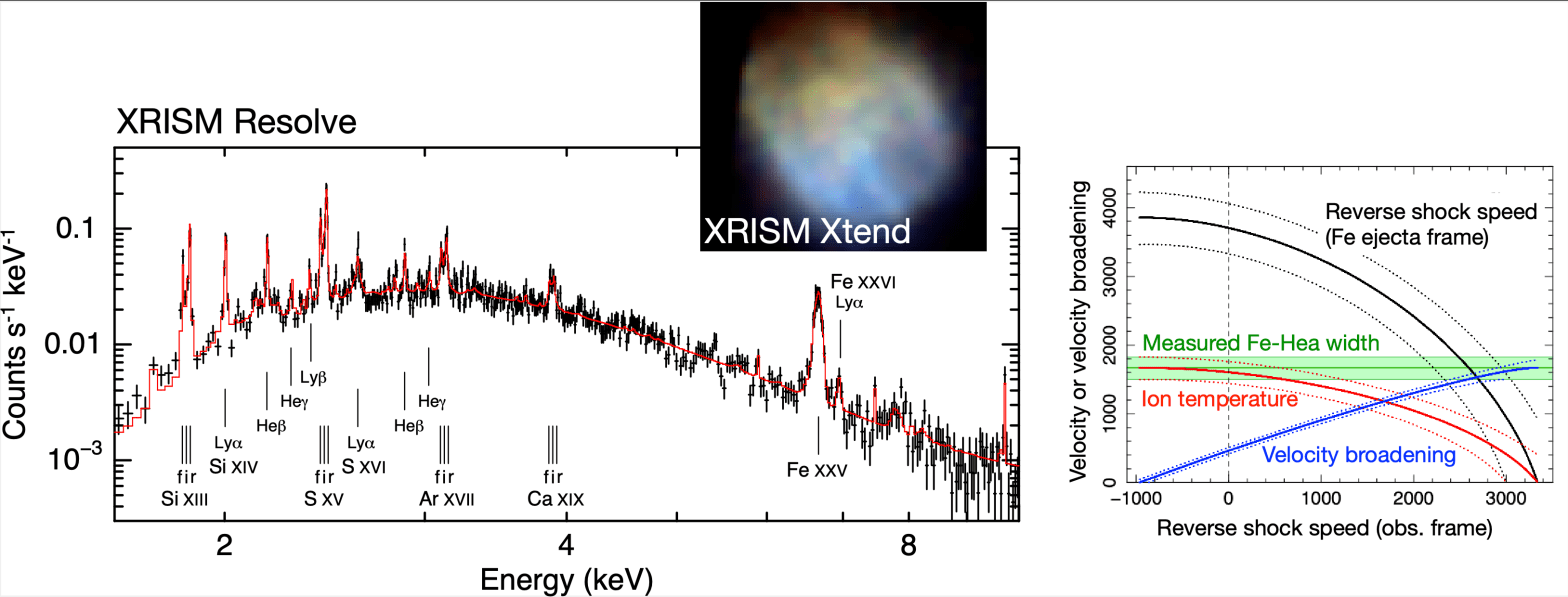 XRISM collaboration’s first paper on the LMC supernova remnant N132D has been accepted for publication in PASJ (ADS link). We successfully constrained the line widths and redshifts, and thereby confidently separated multiple temperature components. The narrow lines of Si, S, and Ar, and a broad Fe Hea triplet can be understood as due to different ion temperatures. Discussion based on line broadening is so exciting as it is brand new in the field of supernova remnants.